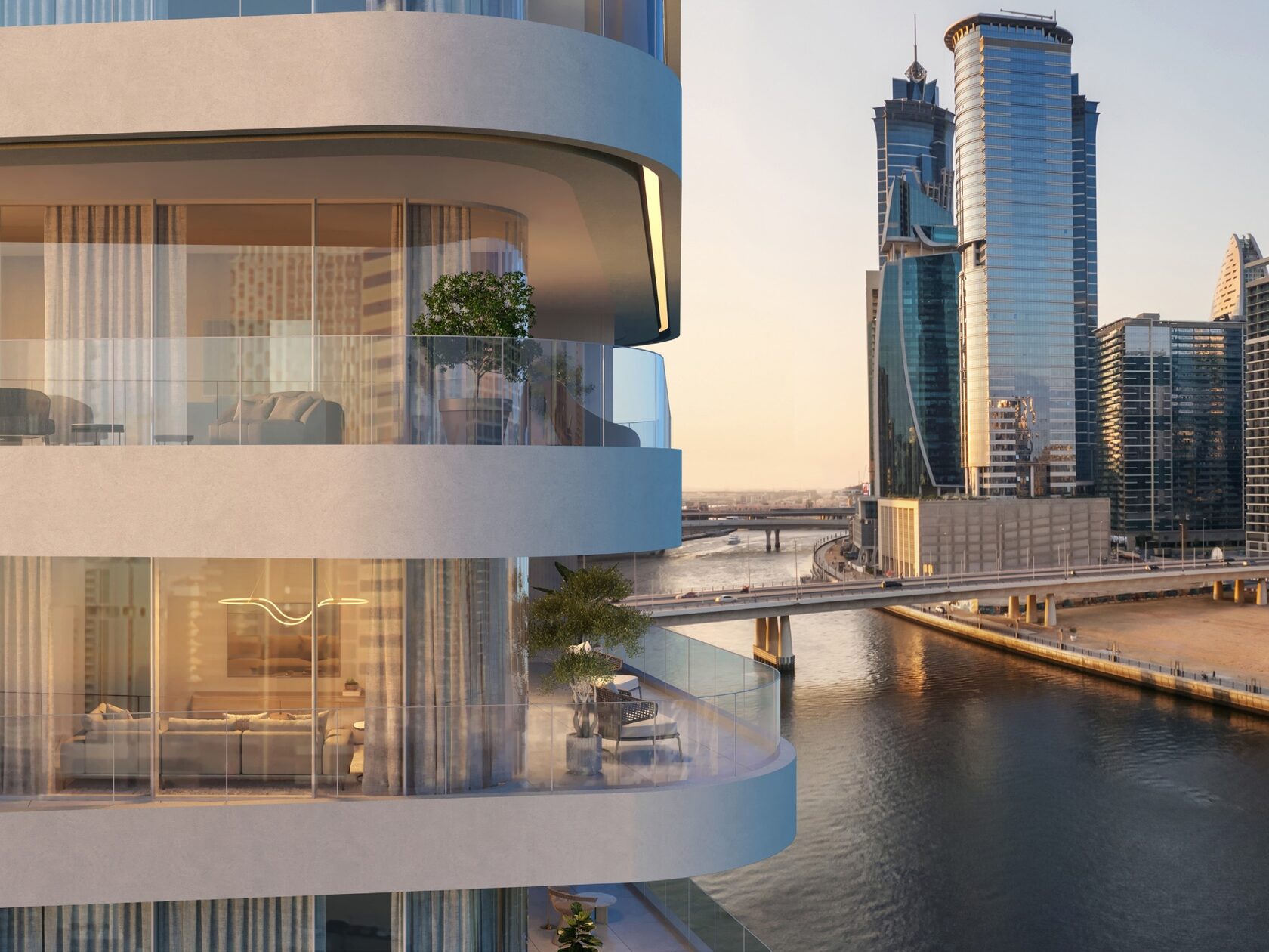 Designed by the globally acclaimed architecture firm Gensler, DG1 Tower stands as a true architectural statement. The façade is sculpted with fluid curves and artistic symmetry, making it instantly recognizable among Dubai’s most iconic buildings. The structure maximizes both natural light and views — offering residents breathtaking panoramas of the Dubai Canal, Downtown skyline, and Burj Khalifa.